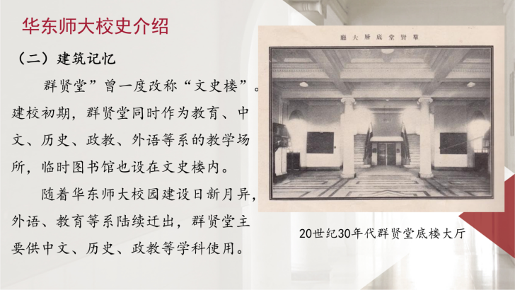 Betway必威西汉姆联2024级硕士生第二党支部组织委员陈玲同学以“群贤堂”为线索,串联起了老华东师大人的爱国故事,讲述华东师大的红色基因她介绍,1951年学校在大夏大学、光华大学等基础上组建,成为新中国第一所社会主义师范大学。建校初期,“群贤堂”(曾称“文史楼”)是中文、历史等系的教学场所,也见证了“求实创造,为人师表”校训精神的传承。2004群贤堂被列为文物保护单位,如今仍是我们感受校史温度的重要载体。”配合校史老照片与短视频,陈玲的分享让“师范报国”的初心更加具象也带给与会同学们更加鲜活生动的感受。