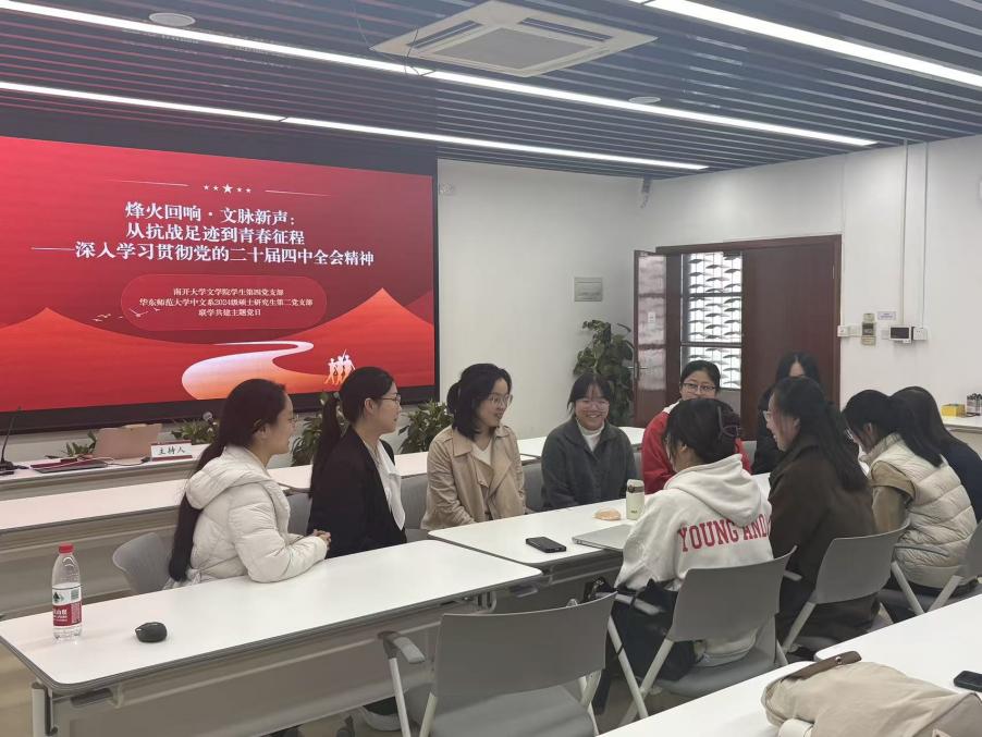 在心得分享环节,南开大学文学院学生第四党支部的王艺蒙、许超群同学结合专业谈了学习体会。王艺蒙提出,作为汉语言文学专业学生,既要深耕经典传承文脉,也要探索用青年喜闻乐见的形式讲好红色故事,让中华文明“活”起来。许超群则表示,全会提出的“提升中华文明传播力影响力”启示大家要学好专业知识,未来在国际交流中做好“文化摆渡人”。