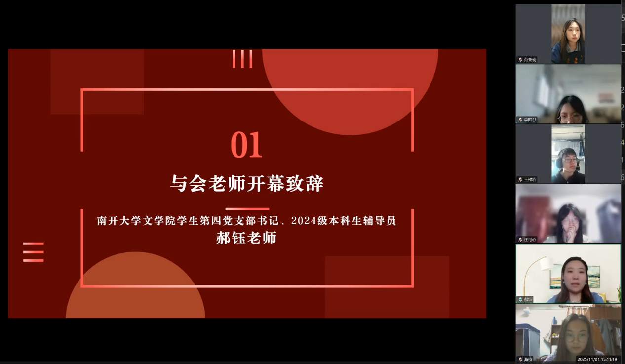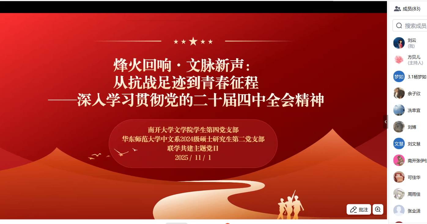 为深入学习贯彻党的二十届四中全会精神,传承红色校史基因,激发新时代青年党员的历史自觉与使命担当,2025年11月1日下午,Betway必威西汉姆联2024级硕士研究生第二党支部与南开大学文学院学生第四党支部以“烽火回响・文脉新声:从抗战足迹到青春征程”为主题,通过腾讯会议线上开展联学共建主题党日活动。两校近百名党员齐聚“云端”,在回望历史、共学精神中凝聚青春力量。