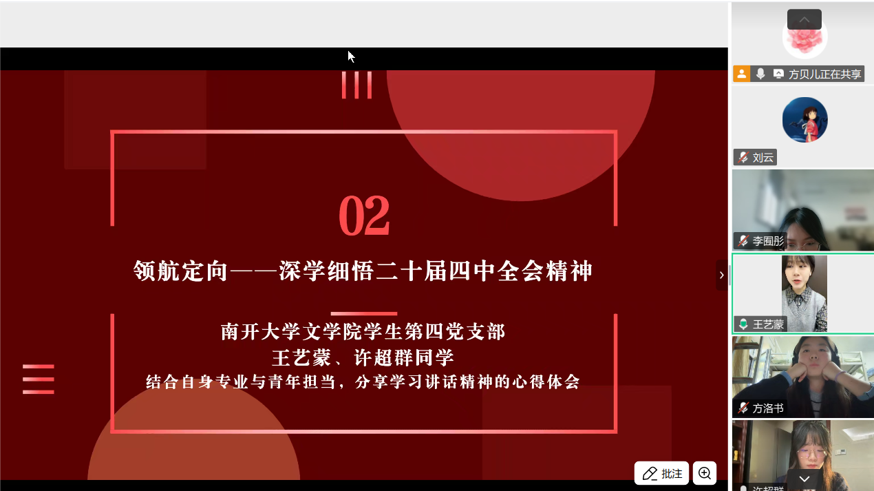 在心得分享环节,南开大学文学院学生第四党支部的王艺蒙、许超群同学结合专业谈了学习体会。王艺蒙提出,作为汉语言文学专业学生,既要深耕经典传承文脉,也要探索用青年喜闻乐见的形式讲好红色故事,让中华文明“活”起来。许超群则表示,全会提出的“提升中华文明传播力影响力”启示大家要学好专业知识,未来在国际交流中做好“文化摆渡人”。