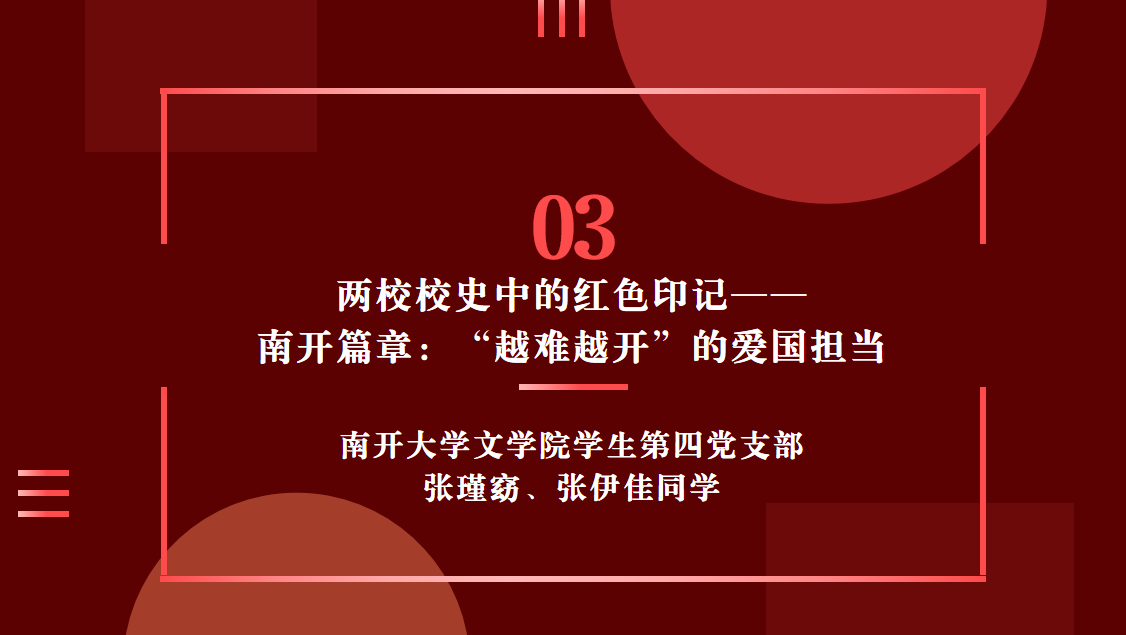 首先由南开大学校史宣讲团成员带来专业讲解。南开大学文学院学生第四党支部的张瑾窈、张伊佳同学带来“南开篇章”的娓娓分享。“1937年7月28日,日军轰炸南开大学,校园化为焦土,但张伯苓校长说‘南开之物质可毁,南开之精神不灭’——正是这份不屈,让南开师生南迁,与北大、清华组建西南联大,在烽火中弦歌不辍。”从抗战时期“读书不忘救国”的师生事迹,到西南联大时期杨石先先生坚持战时科研的“南开之光”,再到叶嘉莹先生1979年转蓬万里回国任教、传播中华诗教的坚守,生动诠释了“越难越开”的南开精神。讲解深入浅出,完整呈现了南开校史中“允公允能,日新月异”的动人底色。