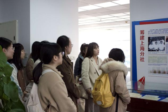 在东方出版中心总编办公室(审校中心)副主任姜小明的带领下,实践团先后参观了出版中心历史陈列展、东方虹桥国际创意出版产业基地及学术文化分社、国际部分社编辑办公区。